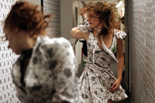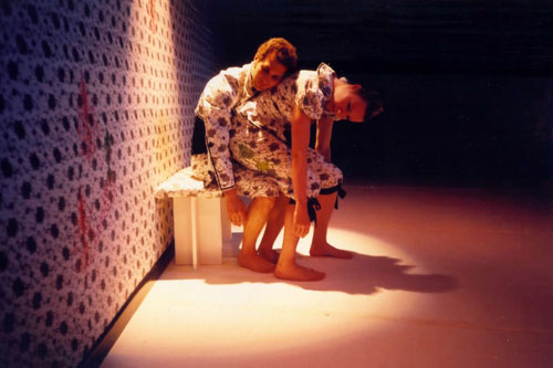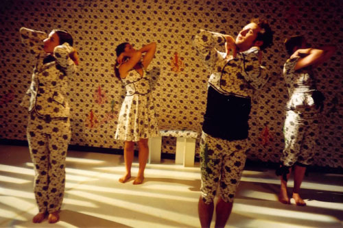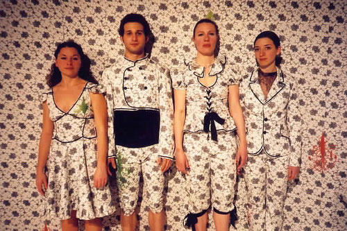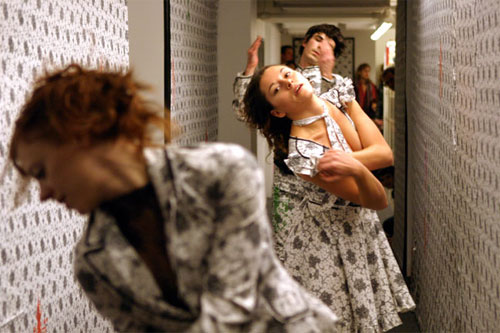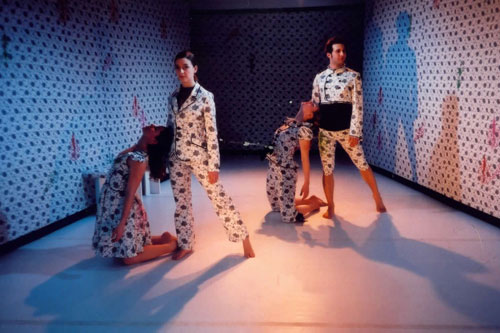 A psychadelic study of the extra-pedestrain, BROQUE investigates the choreographers' obsession with public spaces, hotel hallways, airport walkways, camouflage and filigree. The piece, which features a set made of wallpaper and matching costumes, follows four characters enclosed in a corridor-like structure. Utilizing an intricate, highly structured movement vocabulary, the dancers individual characteristics, initially disguised by their landscape, gradually become revealed. In this contained environment, the role of camouflage is particularly emphasized, as the performers literally blend into their backdrop. The piece was re-staged in April 2005, and installed to fit inside the unusual performance venue of Fritz Haeg's geodesic dome, in his Sundown Salon series in Los Angeles, CA.