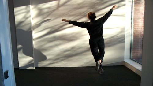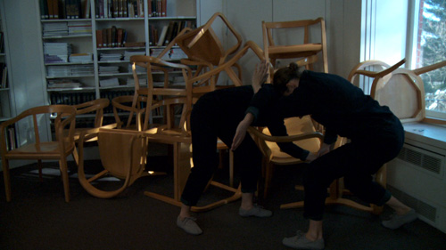 For Temporary Structures, robbinschilds created site-reactive videos/movement pieces, Constructions I-IV, in response to the deCordova Museum building's character and form – itself a strange hybrid of old and new architecture. As such, the building became their score or set of instructions as they created specific choreography for three particular spaces: the large, open Joyce and Edward Linde Gallery; the book-lined DeNormandie Library; and a small, well-lit window gallery at the end of the fourth-floor hallway. Working from their sensibility of heightened or "extra-pedestrian" movement, robbinschilds performs what we in fact do each and every day – adjust our bodies to our given spaces – making clear the physical and energetic relationship between our bodies and architectural spaces.