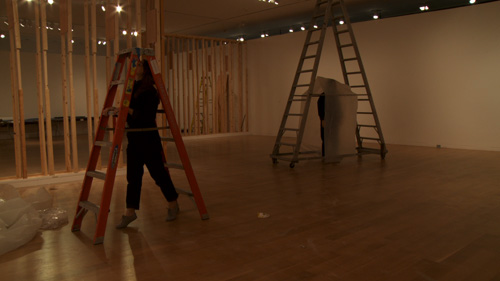 Following the logic of site-reactive work, Constructions I, II, III, IV change in character and content in each given space. In the large exhibition gallery, the Joyce and Edward Linde Gallery, the artists choreographed their movements for the camera – setting up a static frame and creating a series of improvisational explorations within those set borders. robbinschilds worked in the gallery mid-construction as the museum deinstalled an exhibition, tapping into the transformative process the gallery takes from one temporary exhibition to the next. In the DeNormandie Library, a drastically smaller and more intimate space, the artists shifted from the Linde Gallery's more pedestrian movement – actions based on basic, everyday gestures – to a more formal dance vocabulary in response to the nature of a room surrounded by books and designed as a meeting space. And finally, in the even smaller fourth-floor gallery space, robbinschilds set up an instructional piece in which each artist created movement language as a set of directives in response to the details of the room – a large window, a door, low ceilings, etc – that the other then interpreted through their own movement. These same scores are made audible for deCordova visitors as a sound work, culminating in a participatory piece in which we are asked to behave, move, and think about this tiny gallery less as a space and more as a stage." –Dina Deitsch, Curator Temporary Structures: Performing Architecture in Contemporary Art